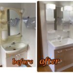 洗面台のリフォーム工事が完工しました。 既存の洗面台を撤去して新しい洗面台を据付しますが、排水の位置を合わせて…